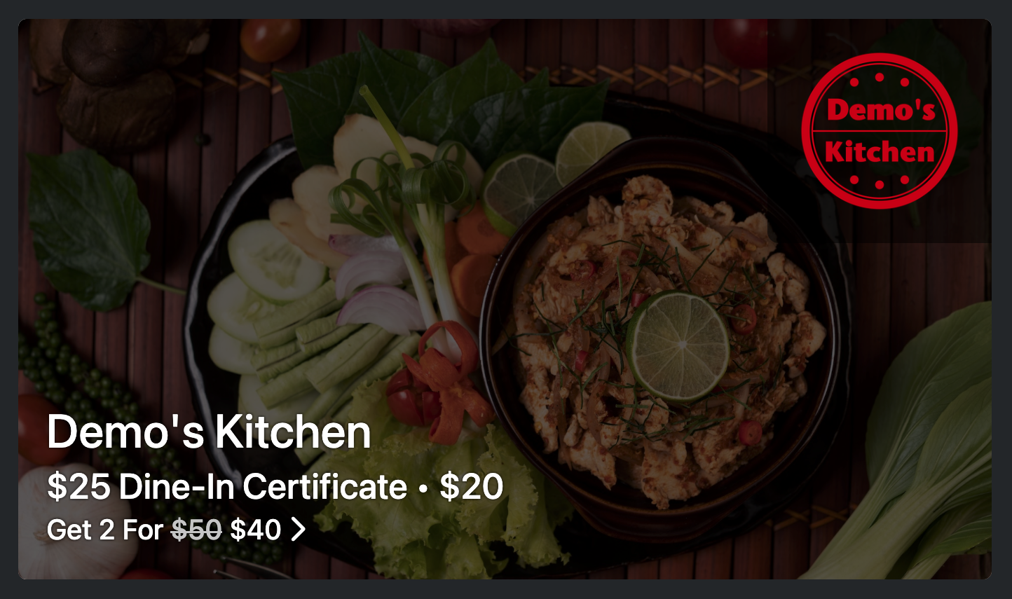 Certificates usually represent some type of deal. Certificates are different from eGift Cards in that there is no running balance; the entire 'deal' needs to be redeemed on one visit.