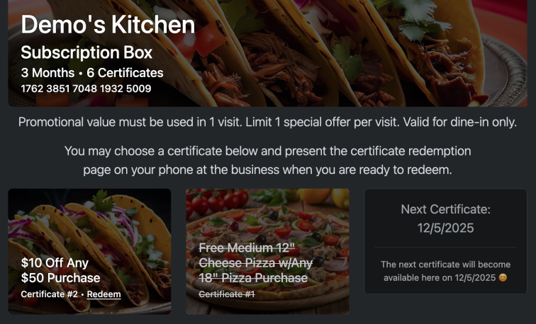 Subscription Box Offers work similarly to what you're already familiar with for physical products. The customer pays up front for a 3, 6 or 12 month subscription, and every week, every two weeks or once a month they receive a new certificate. One nice thing about Subscription Boxes over ... View
